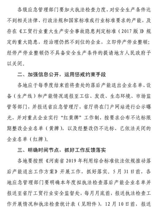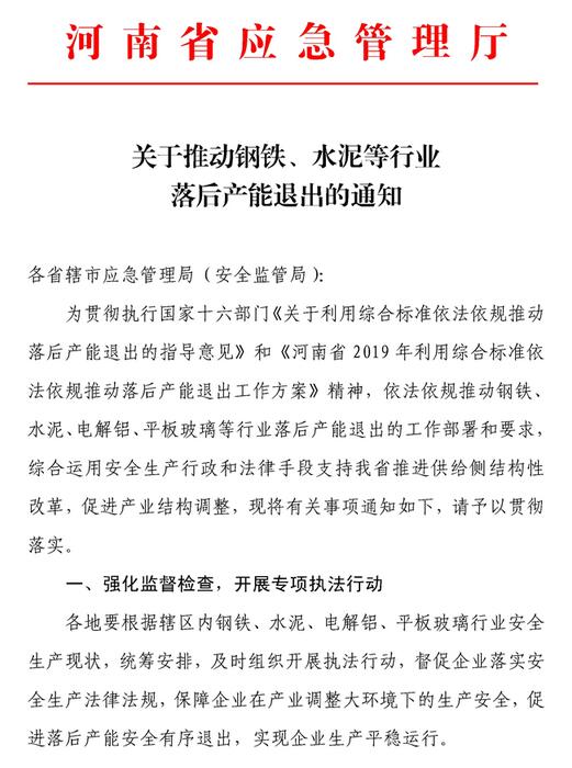 4月25日,河南省應急管理廳下發《關于推動鋼鐵、水泥等行業落后產能退出的通知》?!锻ㄖ访鞔_表示將利用安全生產行政和法律手段推進水泥、鋼鐵等行業落后產能退出?!锻ㄖ芬蟾骷墤惫芾聿块T要加大執法檢查力度,對安全生產條件達不到相關法律、行政法規和國家標準或行業標準要求的產能,及存在《工貿行業重大生產安全事故隱患判定標準(2017版)》規定的重大隱患,經治理仍然不到位的企業,立即停業停產整頓;經停業停產整頓仍不具備安全生產條件的提請地方人民政府予以關閉。