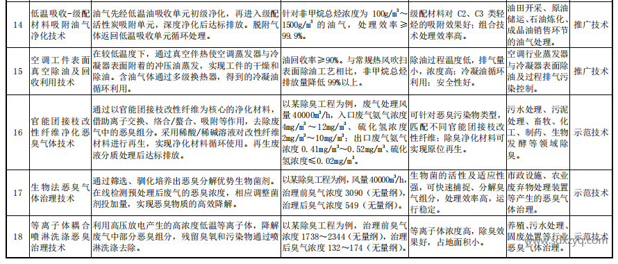 在這些技術(shù)中,有幾項(xiàng)特別引人注目。例如,低溫吸收-級(jí)配材料吸附油氣凈化技術(shù)、空調(diào)工件表面真空除油及回收利用技術(shù)被歸類為推廣技術(shù),這意味著這些技術(shù)已經(jīng)具備了廣泛的應(yīng)用基礎(chǔ)和良好的市場前景。而冷凝-吸附-催化油氣回收凈化技術(shù)、官能團(tuán)接枝改性纖維凈化惡臭氣體技術(shù)、生物法惡臭氣體治理技術(shù)和等離子體耦合噴淋洗滌惡臭治理技術(shù)被列為示范技術(shù),顯示了這些技術(shù)在創(chuàng)新性和應(yīng)用潛力上的優(yōu)勢。