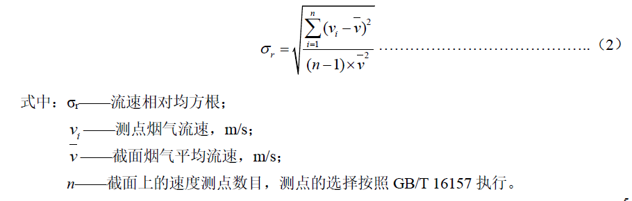 新建煙氣排放污染源的在線監測設備安裝要求,采樣平臺應與排氣裝置同步設計、同步建設,確保采樣斷面滿足本標準 7.1.2.2 的要求;對于現有排放源,當無法找到滿足 7.1.2.2 的采樣位置時,應盡可能選擇在氣流穩定的斷面安裝 CEMS 采樣或分析探頭,并采取相應措施保證監測斷面煙氣分布相對均勻,斷面無紊流。對煙氣分布均勻程度的判定采用相對均方根σ 法,當σ ≤0.15 時視為煙氣分布均勻,σr 按式(2)計算。