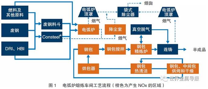 對于電弧爐熔煉車間,凡是帶有電弧或燒嘴的工藝或設備都應被視為NOx的排放源,但正如本文后面將看到的,實際并不僅限于此。