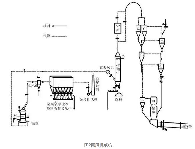 兩風機系統(tǒng)是三風機系統(tǒng)的簡化,生料磨采用輥磨時非常合適,它簡化了工藝,設(shè)備布局緊湊,投資低。但三風機變?yōu)閮娠L機系統(tǒng)后,系統(tǒng)設(shè)備負壓明顯提高,系統(tǒng)對設(shè)備漏風更為敏感,需要更嚴格管理。兩風機系統(tǒng)實際應(yīng)用偏少,但在我國以海螺集團為代表的水泥生產(chǎn)線上卻有大量應(yīng)用。實踐表明,生產(chǎn)管理得好時,兩風機系統(tǒng)會比三風機系統(tǒng)節(jié)能。