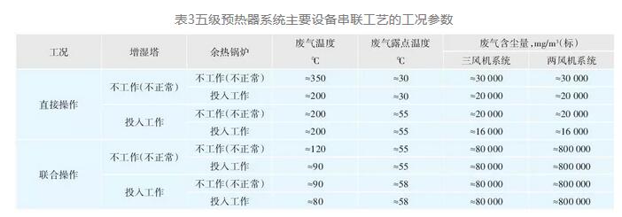 水泥窯尾廢氣處理系統(tǒng)都是按含生料磨烘干聯(lián)合操作廢氣考慮的,特點是工況參數(shù)常變,以典型的五級預(yù)熱器系統(tǒng)主設(shè)備串聯(lián)工藝為例,即圖1、2示意的工藝,至少可以產(chǎn)生如表3的工況參數(shù)。