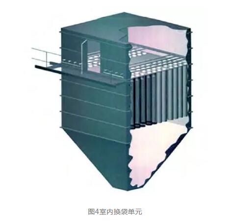 2005年,結(jié)合琉璃河水泥廠窯尾電除塵器改造,我們開始推出凈氣室室內(nèi)換袋結(jié)構(gòu)的袋除塵器(圖4),大大降低了整機漏風率。