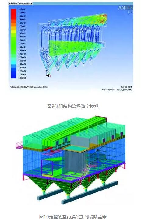實際上,該綜合平臺是我們在生產(chǎn)過程中分段研發(fā)的。首先通過數(shù)字流場計算的模擬,確定了公司標準袋除塵器系列及多種非標改造的低阻結(jié)構(gòu)(圖9、10)。