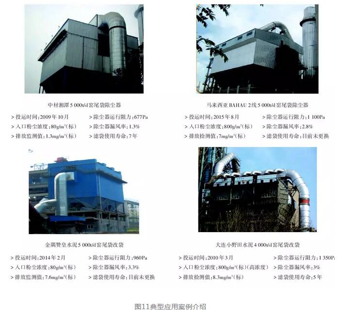 項目技術(shù)成果應(yīng)用在公司袋除塵器設(shè)計的四大產(chǎn)品系列和幾百臺“電改袋”除塵器改造,大大縮短了產(chǎn)品設(shè)計周期,有效提升了袋除塵器的各項技術(shù)指標和工作可靠性,穩(wěn)定達到低排放效果,設(shè)備平均運行阻力降低,節(jié)能環(huán)保效果明顯。圖11為幾個典型應(yīng)用案例。