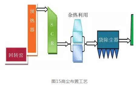 圖15為高塵SCR布置工藝,國外早期有此方案實施的報導(dǎo)。它是將催化反應(yīng)器布置在預(yù)熱器C1旋風筒廢氣出口處,此處的溫度較高(約350℃),可以滿足常規(guī)SCR催化劑反應(yīng)需要的溫度。但是該處的粉塵濃度可達60~80g/m3(標),對催化劑的沖刷磨損大,催化劑堵塞的風險也比較大,所以對清灰(吹灰)系統(tǒng)要求很高。另外,各種有害成分引起的催化劑中毒也會嚴重,甚至短期運行即失效,因此一直不被業(yè)界所接受。