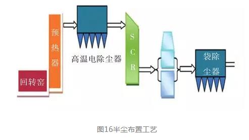 圖16為水泥廠SCR脫硝的半塵布置或中塵(MiddleDust)布置工藝,它需要在SCR反應(yīng)器之前安裝高溫電除塵器。因為高溫電除塵器的除塵效率不能達到很高,所以出口含塵量仍然較高,特別是除塵器電場事故致使廢氣含塵量高不可避免,半塵布置方案也與高塵方案存在同樣問題。另外,通過高溫電除塵器的氣體溫度還會有所降低,也不利于常規(guī)催化劑高效運行。國內(nèi)外實際應(yīng)用的報導(dǎo)都同樣是不能穩(wěn)定運行。