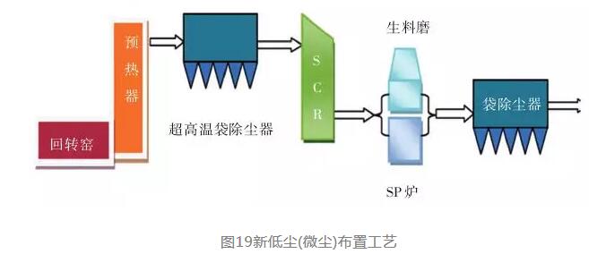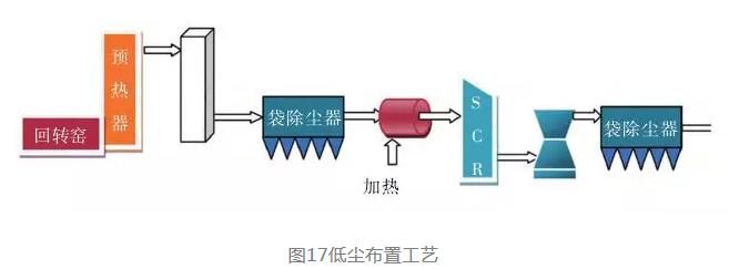 圖17為傳統(tǒng)的低塵布置工藝,采用傳統(tǒng)的高溫袋除塵器可以保證進入SCR反應(yīng)器的廢氣含塵量極低,這樣粉塵對SCR催化劑的影響小。但由于傳統(tǒng)濾袋的耐溫限制,通常需要采用六級預(yù)熱器,或優(yōu)先通過SP余熱鍋爐降溫,或采用增濕塔將預(yù)熱器出口廢氣溫度降低到≤280℃,并且不允許出現(xiàn)超溫事故。降溫除塵后,為了滿足氮氧化物最佳催化還原反應(yīng)溫度,需要對煙氣進行再加熱,這無疑會使工藝復(fù)雜且有能源消耗。如果研發(fā)出有效可靠的低溫催化劑,無需對氣體再加熱,則是一個理想的選擇。