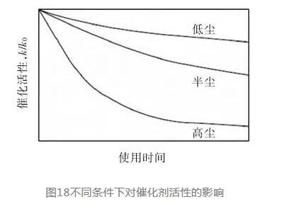 國外有關(guān)研究實驗結(jié)果給出了催化劑活性使用壽命與氣體含塵量的關(guān)系(見圖18)。由此可見,氣體含塵量高會大大縮短水泥SCR脫硝催化劑的使用壽命,水泥窯尾的高塵布置方案會更糟。