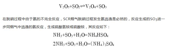 由于煙氣中存在SO2等氣體,催化劑中的活性成分釩盡管是選擇催化降解NOx的,但也會對SO2的氧化起到一定的催化作用,SO2的氧化率隨活性組分V2O5含量的增加而上升,其反應(yīng)式如下: