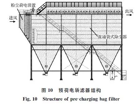 針對轉爐二次煙氣的排放特征,中鋼集團天澄環保科技股份有限公司開發了預荷電袋濾器除塵技術,將預荷電和直通式袋式除塵器復合形成一體化裝置,如圖10所示。粉塵預荷電后在濾袋表面將形成海綿狀粉餅結構,能提高凈化效率,同時降低運行阻力。中鋼天澄在鞍鋼煉鋼總廠2×180t轉爐二次煙氣凈化項目中建成示范工程,處理風量2×60萬m3/h。2014年12月正式投運,截止目前持續穩定,運行可靠,顆粒物排放質量濃度低于10mg/m3,技術性能指標達到超低排放,運行阻力為700~1 000Pa,低于傳統袋式除塵器。目前,在日照鋼鐵、新余鋼鐵、正大特鋼、唐鋼青龍、柳鋼等得到推廣應用。