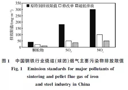 針對燒結、球團工序的排放限值變化如圖1所示。2017年6月中國環境保護部發布了《鋼鐵燒結、球團工業大氣污染物排放標準》修改單(征求意見稿),提出顆粒物特別排放限值從40降至20mg/m3,SO2特別排放限值從180降至50mg/m3,NOx特別排放限值也從300大幅降至100mg/m3。在2018年政府工作報告中李克強總理提出“推動鋼鐵等行業超低排放改造”。隨后,生態環境部聯合各部委在2019年4月發布《關于推進實施鋼鐵行業超低排放的意見》,將燒結(球團)煙氣中顆粒物、SO2、NOx的超低排放限值分別規定為10、35、50mg/m3,要求到2020年底前,重點區域鋼鐵企業力爭60%左右產能完成改造。