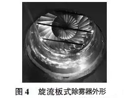 在水洗塔的出口裝設管式和旋流板式雙層除霧器,其中旋流板式除霧器(見圖4)通過機械離心作用,進一步加強煙氣中的氣水分離,降低出口煙氣霧滴濃度。