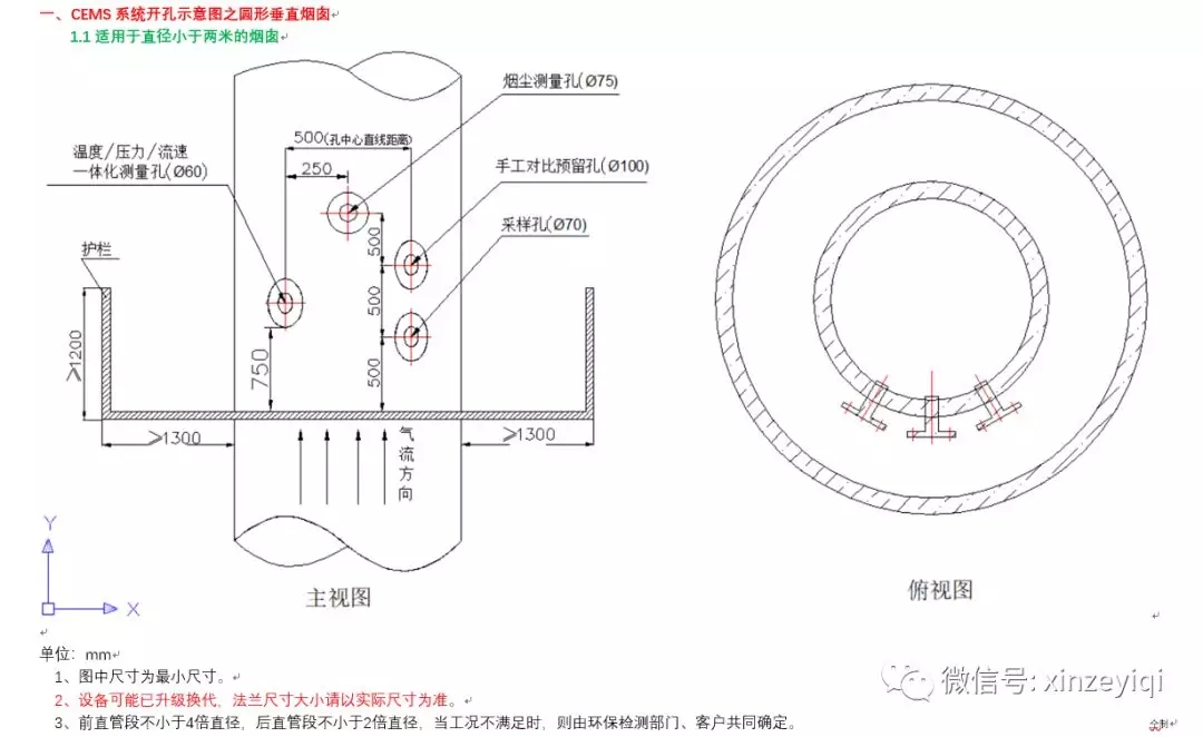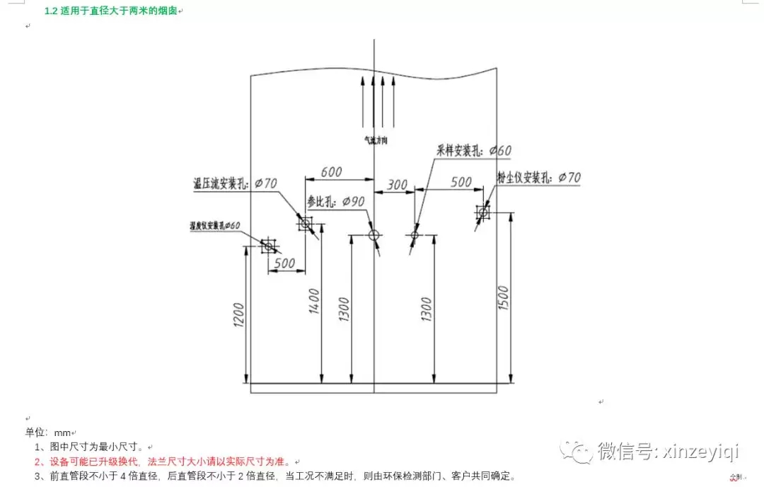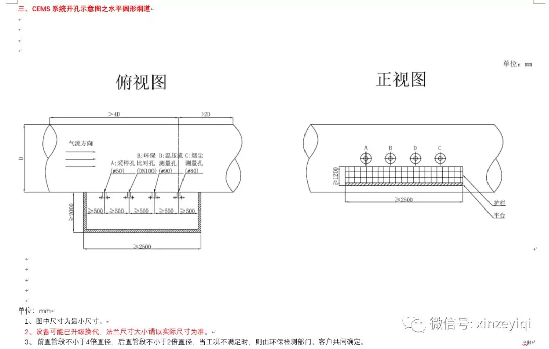 注意:開孔位置及法蘭之間的距離尺寸可以按照開孔示意圖來開孔施工,開孔的大小要根據煙氣在線監測設備生產廠家的實際法蘭大小以及盲管直徑的粗細來施工。