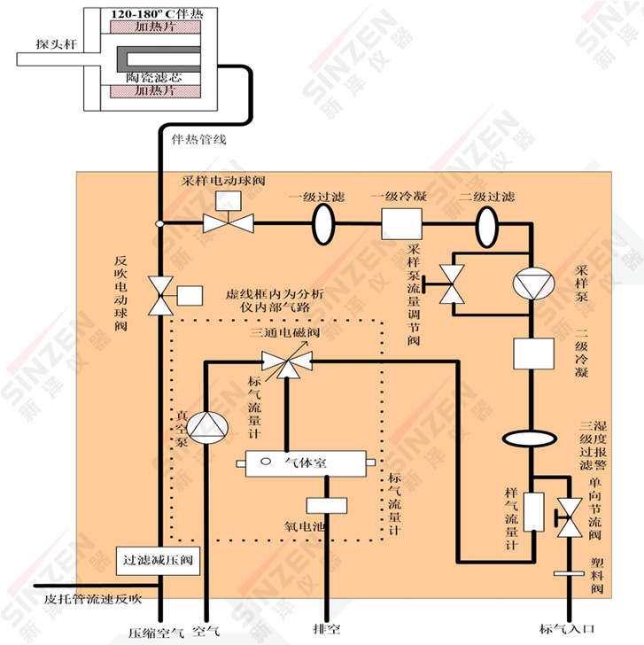 樣氣通過取樣探桿進入到取樣探頭內(nèi),經(jīng)過陶瓷濾芯過濾后,除去樣氣中的粉塵;取樣探頭通過加熱器加熱到120°C~150°C,防止樣氣在經(jīng)過取樣探頭后,產(chǎn)生冷凝水。來自采樣探頭的樣氣經(jīng)高溫伴熱管線,通過二級過濾器除塵,經(jīng)過兩級冷凝系統(tǒng)除水后直接進入分析儀內(nèi)測量氣體室,氣體室放置于分析儀內(nèi),通過紫外光纖連接到紫外差分分析儀,實現(xiàn)對煙氣的測量,最后通過采樣泵將被測煙氣排空;冷凝下來的水經(jīng)排水系統(tǒng)排掉。由控制單元實現(xiàn)自動反吹、自動標(biāo)定、制冷溫度報警提示等功能,并顯示系統(tǒng)的各種工作狀態(tài)。